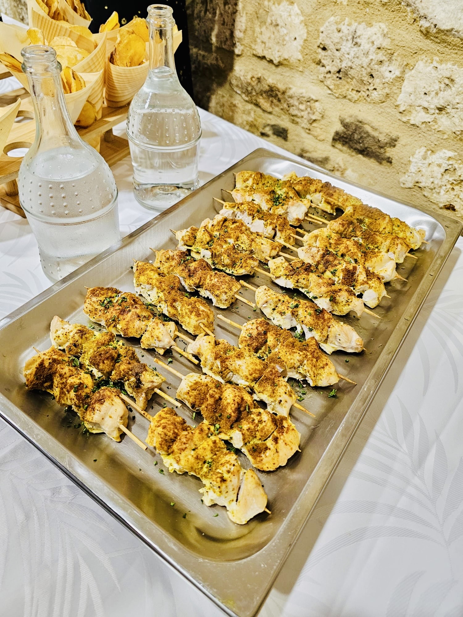 3- Les plaisirs partagés avec Brochettes de poulet marinées, chips maison et salade de pâtes fraîches.